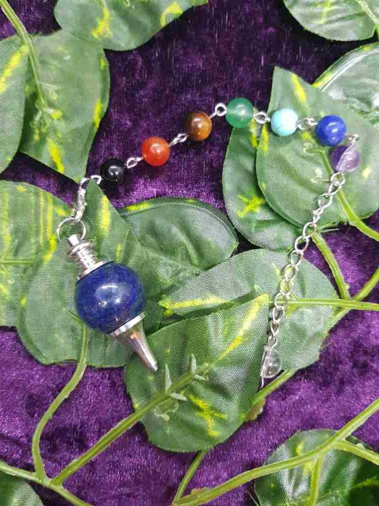 מטוטלת לאפיס לזולי עוצמתית עם שרשרת חרוזי קריסטלים המשקפים את שבעת הצ’אקרות. מצויינת לקבלת מסרים מדוייקים מהאני הגבוה דרך החיזוי. מעולה לעבודה עם הצ’אקרות. לאפיס לזולי היא אבן שמאפשרת לקבל מסרים ברורים מהאני הגבוה לרמה הפיזית, ומסייעת פתיחת העין השלישית. מצויינת למטפלים ומתקשרים.